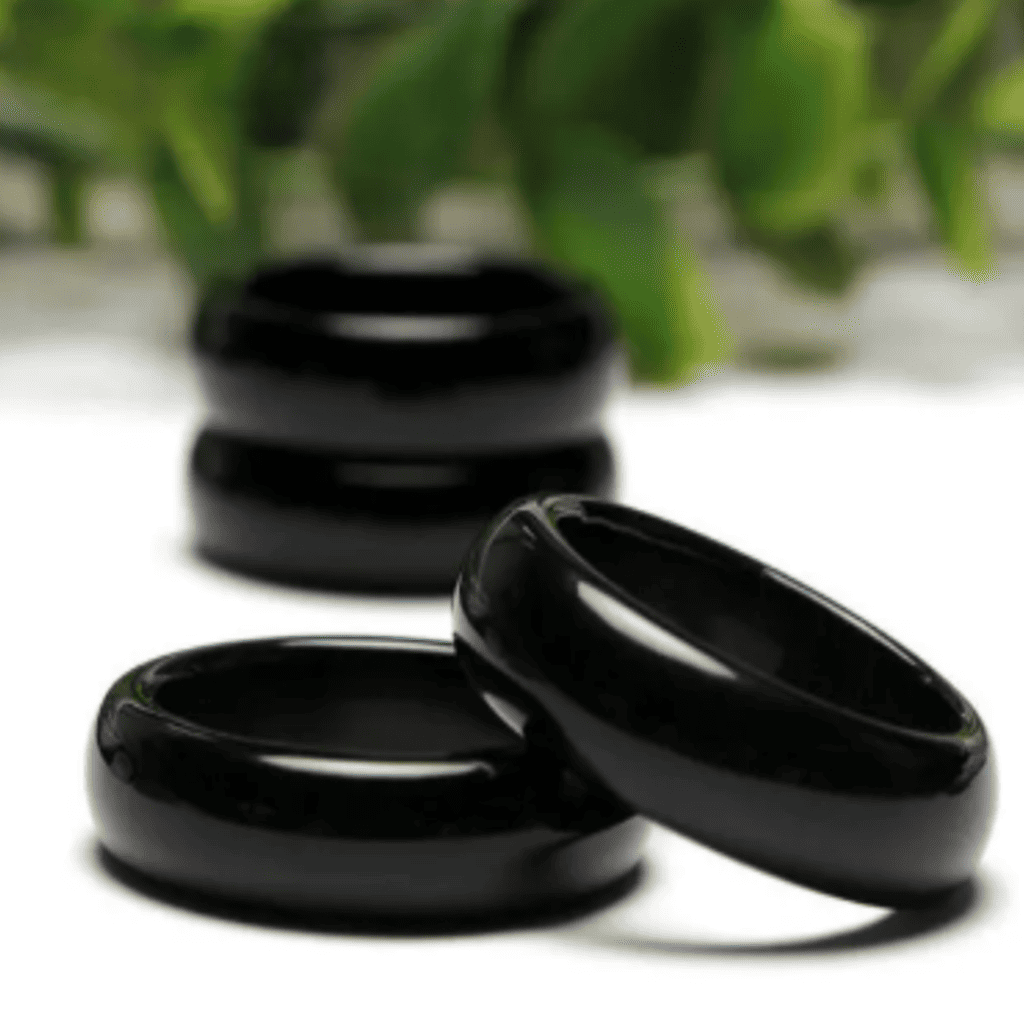 Aliança feita em pedra Ágata Preta, conhecida por seu equilíbrio energético e proteção espiritual. Ideal para quem busca harmonia e vitalidade no dia a dia.