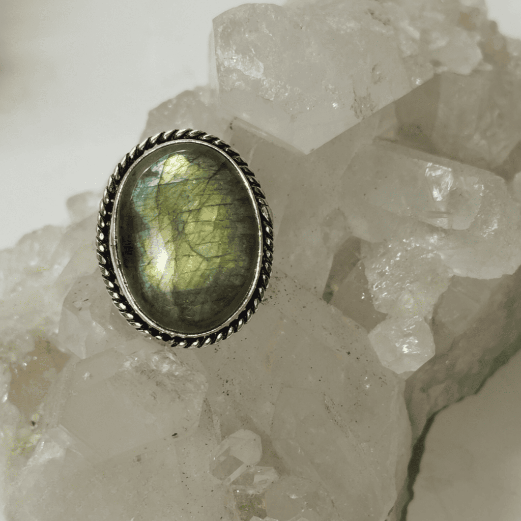 Anel feito à mão com design inspirado em Bali, que destaca a beleza da pedra labradorita. Ideal para quem busca uma joia com estilo e significado.