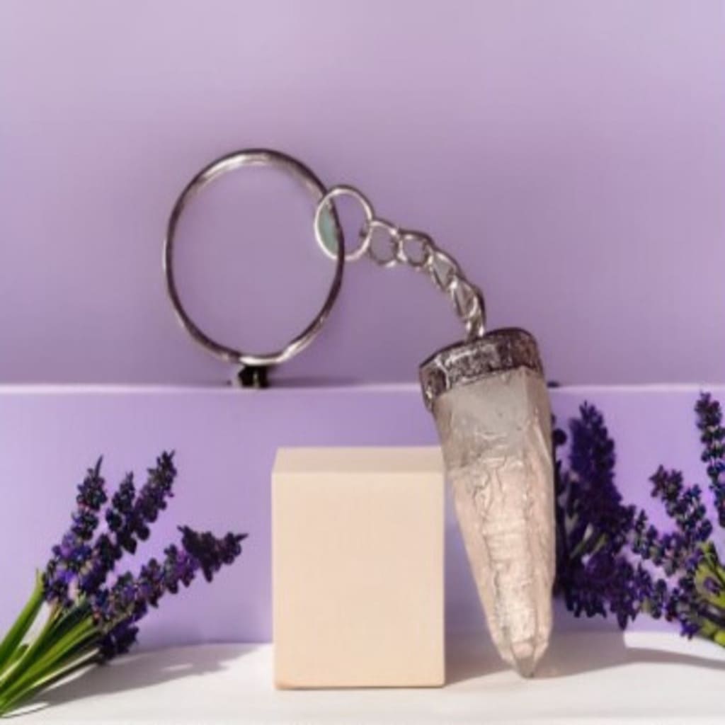 Chaveiro de Cristal Lemuriano com Prata com medidas aproximadas: 3 a 8 cm