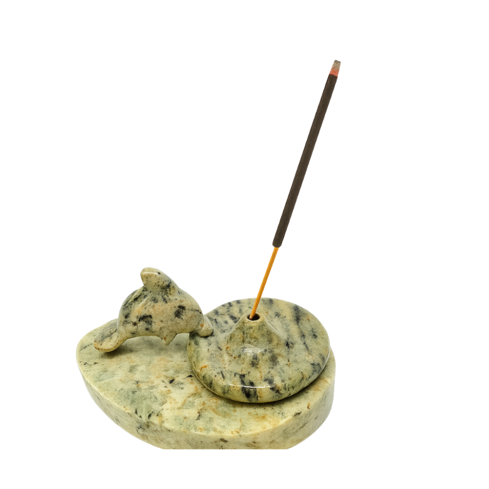 O incensário é produzido em pedra-sabão, conhecida por sua textura macia e durabilidade. Seu formato oval garante O detalhe em forma de golfinho confere uma energia positiva e decoração única ao espaço, perfeita para ambientes.