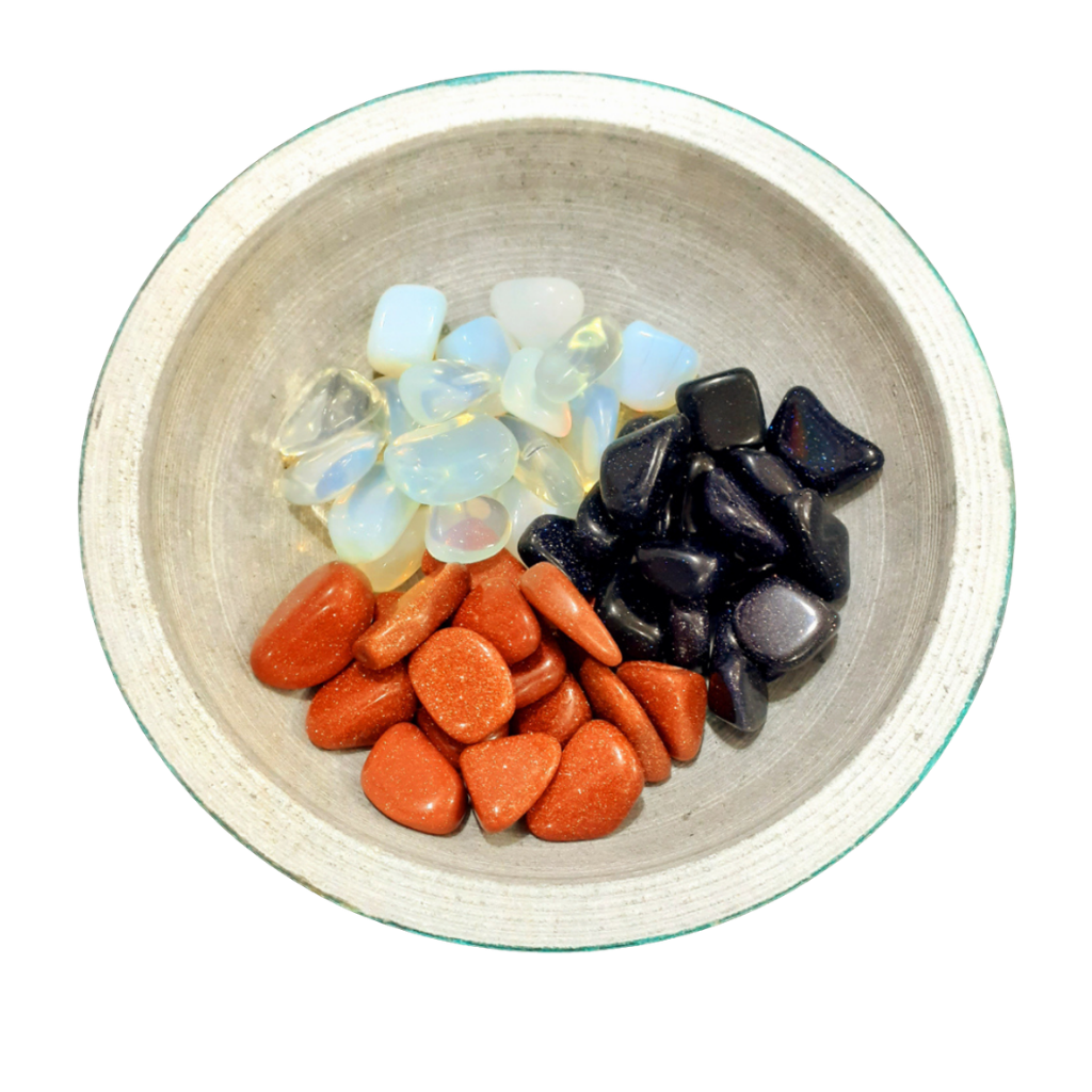 Este kit reúne três tipos diferentes de pedras naturais: a Pedra da Lua, a Pedra Estrela e a Pedra do Sol. Cada uma possui características únicas que auxiliam na harmonização energética e podem ser usadas para fins esotéricos e decorativos.