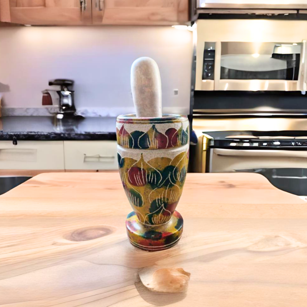 Um pilão funcional e decorativo feito em pedra sabão com pintura colorida artesanal. Ideal para preparar temperos e ingredientes com praticidade.