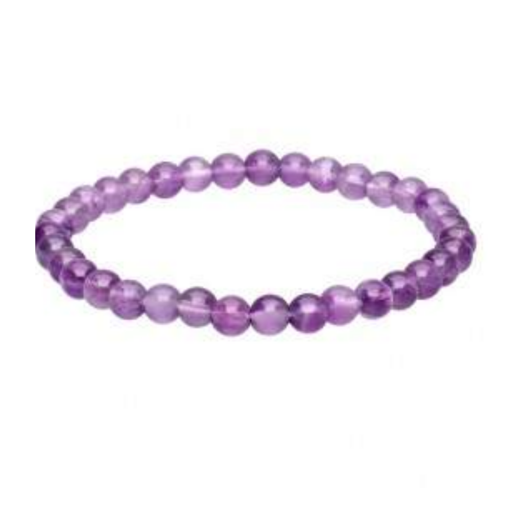 As contas da pulseira são feitas em ametista natural em dois diâmetros, 6mm e 8mm, destacando sua coloração roxa característica. O elástico de alta resistência permite ajuste confortável ao pulso, adequado para uso diário.