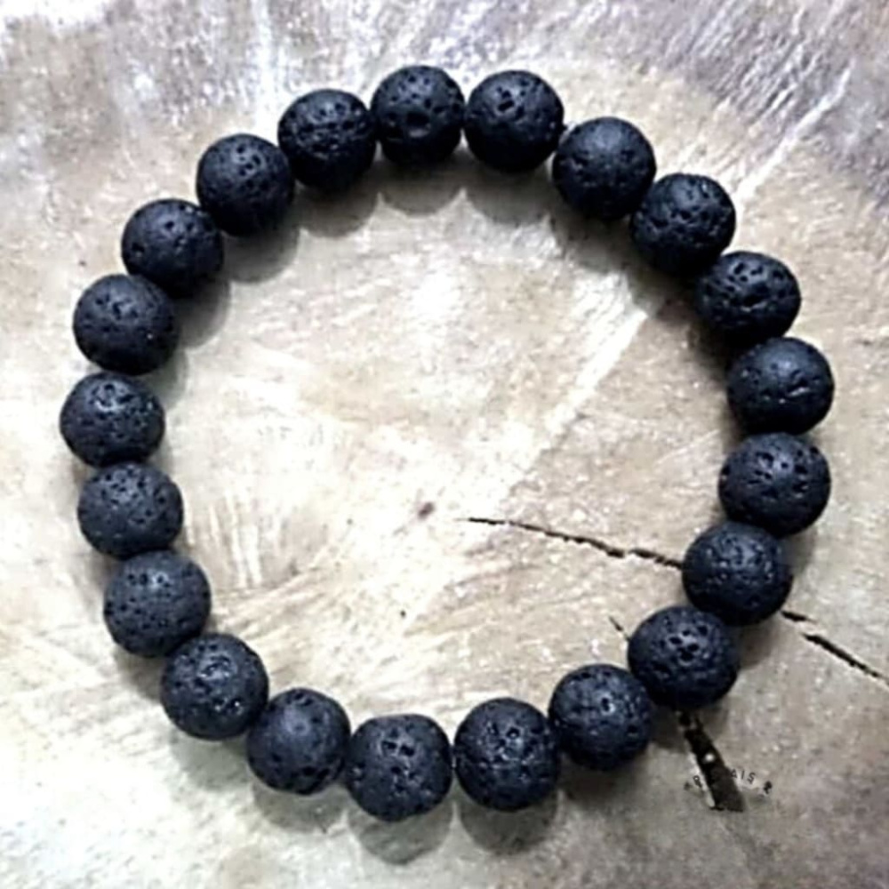 Uma pulseira feita com pedras vulcânicas escuras, perfeitamente arredondadas, com 8mm de diâmetro, ideal para quem busca equilíbrio energético e desbloqueio pessoal.